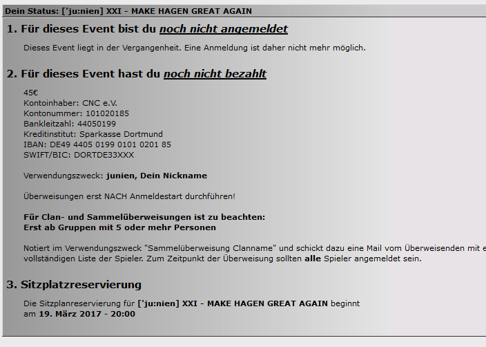Ruhig Blut, Junge. Wie du oben links sehen kannst, ist noch keiner auf bezahlt. Da die Schatzmeisterei des CNC e.V. auch sicherlich noch eine Hauptberuf nachgeht, könnte es mit den Statusänderungen noch 1-2 Stündchen dauern