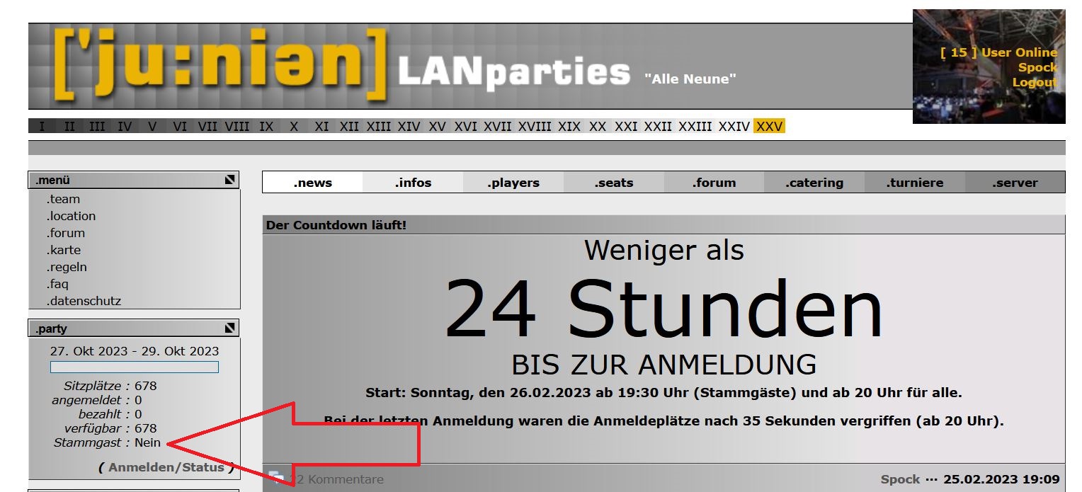 Wer nicht so genau weiß, ob der Treuebonus zur frühzeitigen Anmeldung ab 19:30 Uhr bereits freigeschaltet ist oder nicht, schaut einfach links unter ".party" in der Navigationsspalte nach. Die Voraussetzung für die Freischaltung des Treuebonus: Mindestens acht ['ju:nien]-Teilnahmen (insgesamt) UND mindestens 2 Teilnahmen an den letzten 4 Veranstaltungen. Du: "Häh?" Wir:"Klick den Anhang Du Koffer!" __________________ Team ['ju:nien]